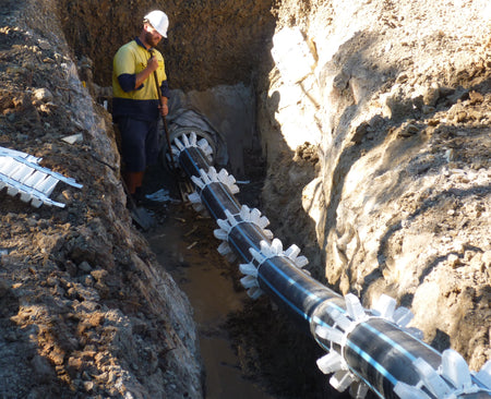 A non corroding, non-metallic casing spacer for Pipe-in-Pipe (PIP) applications such as slip lining and cased crossings for all medium to heavy weight pipe materials including steel, DICL, MSCL, GRE, PVC and HDPE. Suitable for all diameters from 100mm OD to 1600mm OD and beyond by addition of multiple segments.