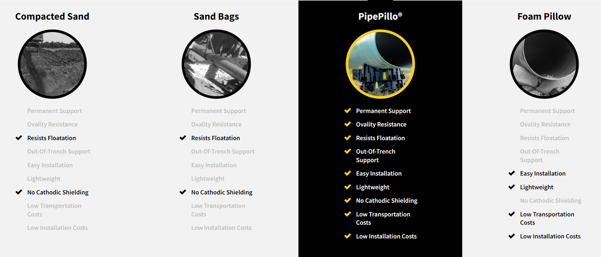 PipePillo® pipeline supports are a high-performance structured pipeline pillow (SPP) designed to permanently support fully-loaded pipelines from the rocky trench bottom. It provides permanent support and is the only engineered solution replacing foam, sandbags and pad dirt.