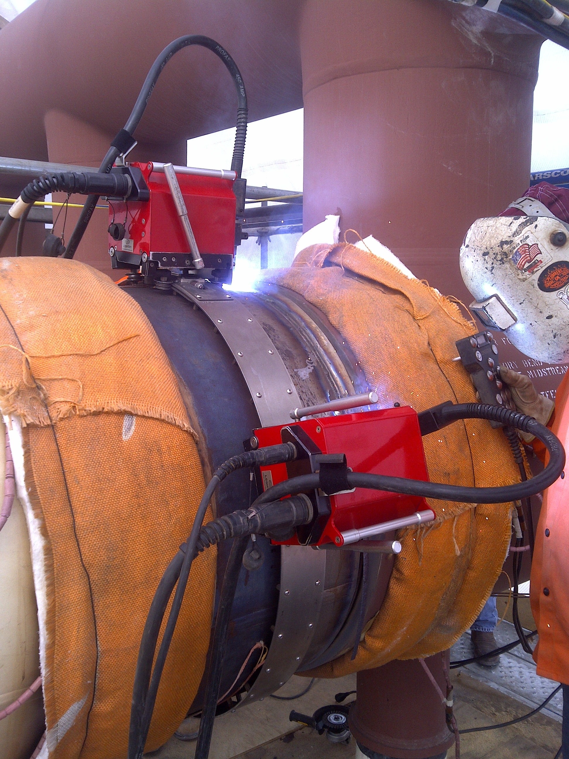 The single torch 5 G bug and band model—a competent welding system for offshore and onshore pipeline industry needs—moves along the seam and can work single, in pair, or even quad if pipe size and production rate require it. The single torch has the capability to move up and down, left and right, which offers extended reach and the ability of 2 G welding. With significant allowable movement, the welding at angles on the pipe surface can be programmed for specific needs.