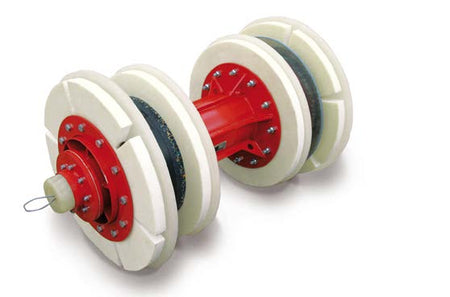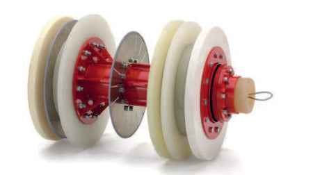 Steel mandrel pigs are a more long-term, long-life pig. They consist of a steel mandrel body with easily replaceable sealing elements (cups or discs) and can be equipped with various brush types (spring-loaded, circular, wrap-around) for the cleaning and removing of deposits on the interior pipe wall. Standard configurations include cup, disc, multi-disc, conical cup, and various combinations. These options include adding or substituting cups or discs, special lengths and diameters, gauging plates, articulated joints, transmitter cavities, and magnet packs. The advantage of steel pigs is the ability to replace the wearing components (cups, discs, brushes, etc.), thereby rendering it a new pig.